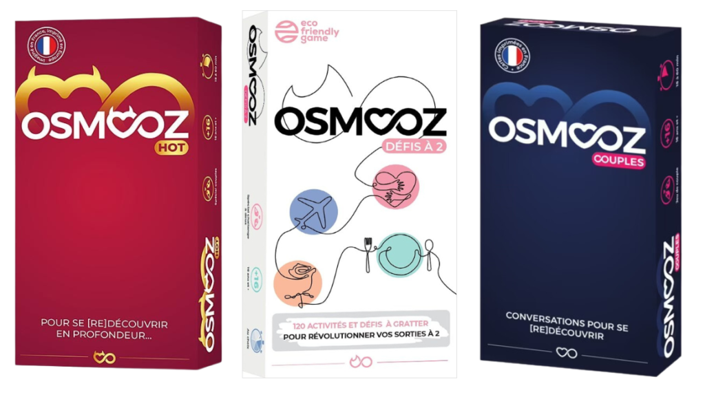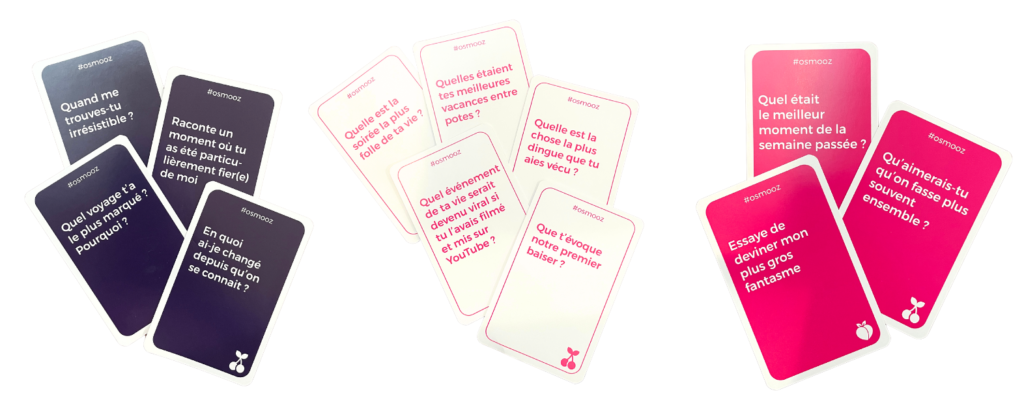Alors, pour profiter d’un moment rien qu’à vous, je vous suggère le jeu « Osmooz ». Osmooz c’est 180 sujets de conversations originaux qui vous feront dériver sur un tas de discussions intéressantes. 3 niveaux de cartes : Flirt (blanc), Passion (rose) et Osmose (bleu).