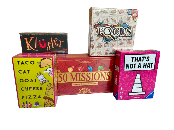 Taco Cat Goat Cheese Pizza : Un jeu de rapidité hilarant où se débarrasser de ses cartes le plus vite possible n’est pas une mince affaire.. Chacun son tour et durant toute la partie, chaque joueur doit répéter un mot du titre : « Taco Cat Goat (ou Bouc) Cheese Pizza », au moment où il retourne une carte. Lorsque le mot énoncé correspond à l’image sur la carte posée, tous doivent taper rapidement au centre de la table. La mince affaire, il y a trois cartes rigolotes en plus qui rajoutent de la difficulté car elles induisent des gestes bien précis avant de taper sur le tas de cartes. Ambiance garantie !